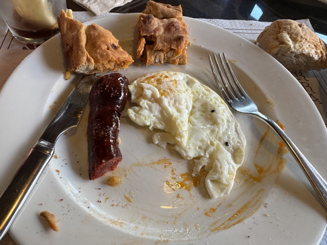 • tortilla de patatas, empanada de bonito y de carne, chorizos, huevos, postres y cafés.